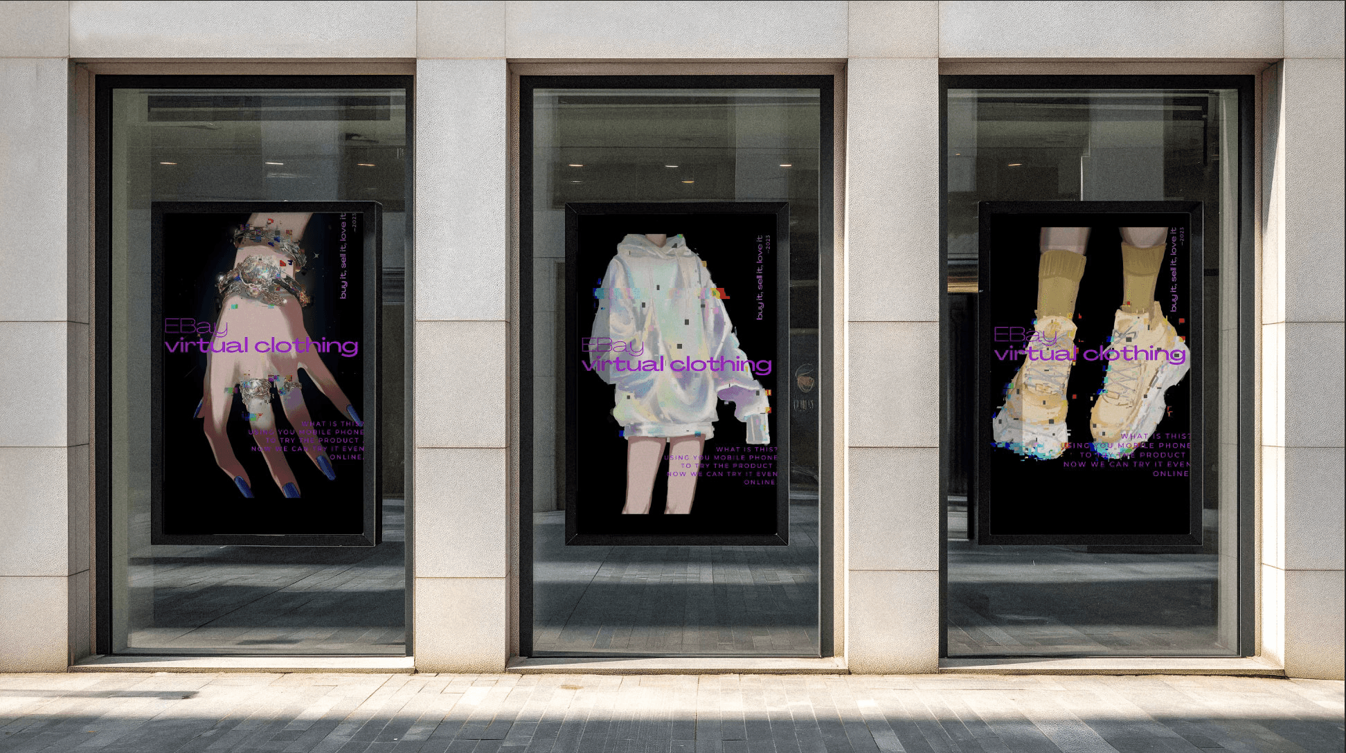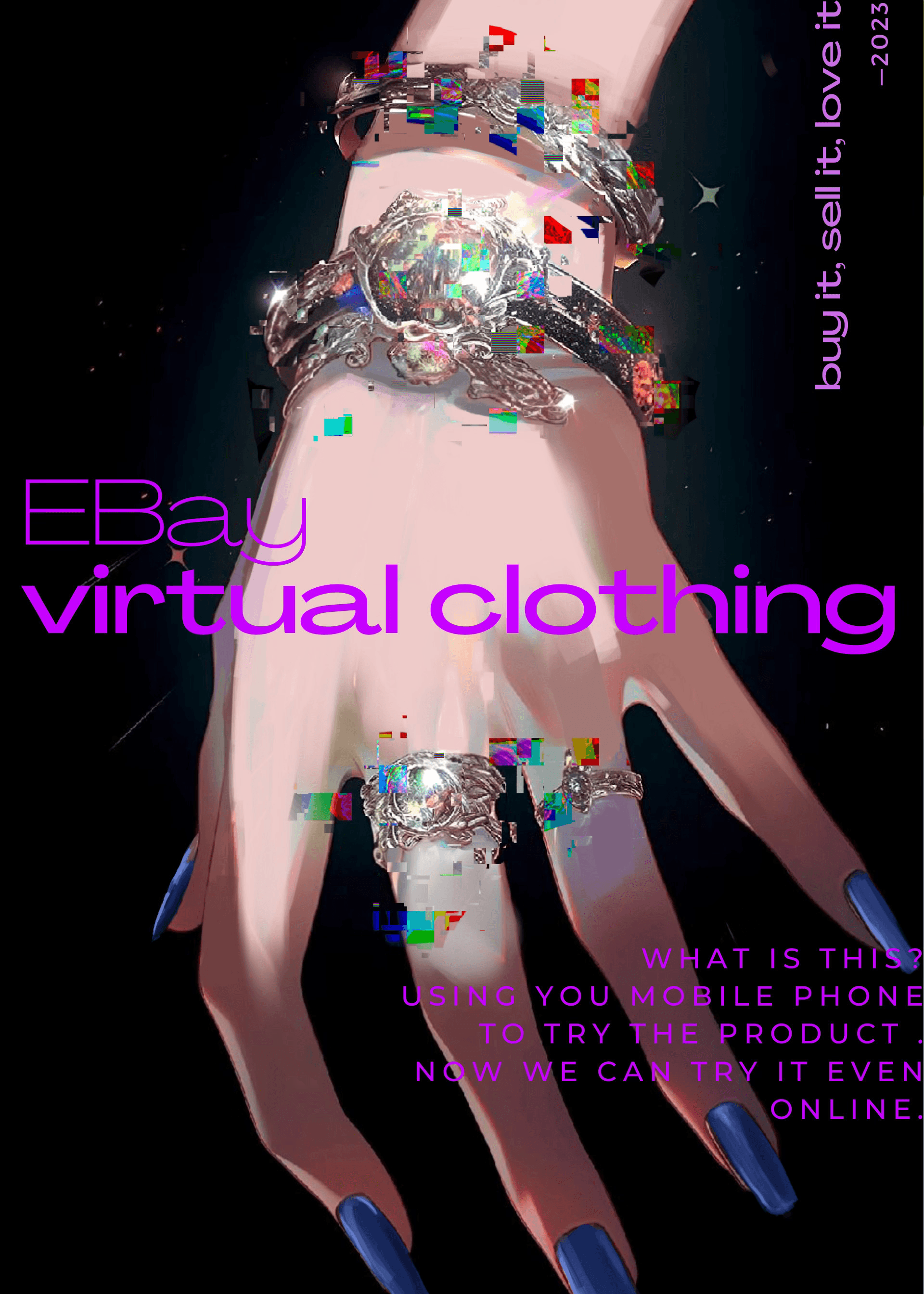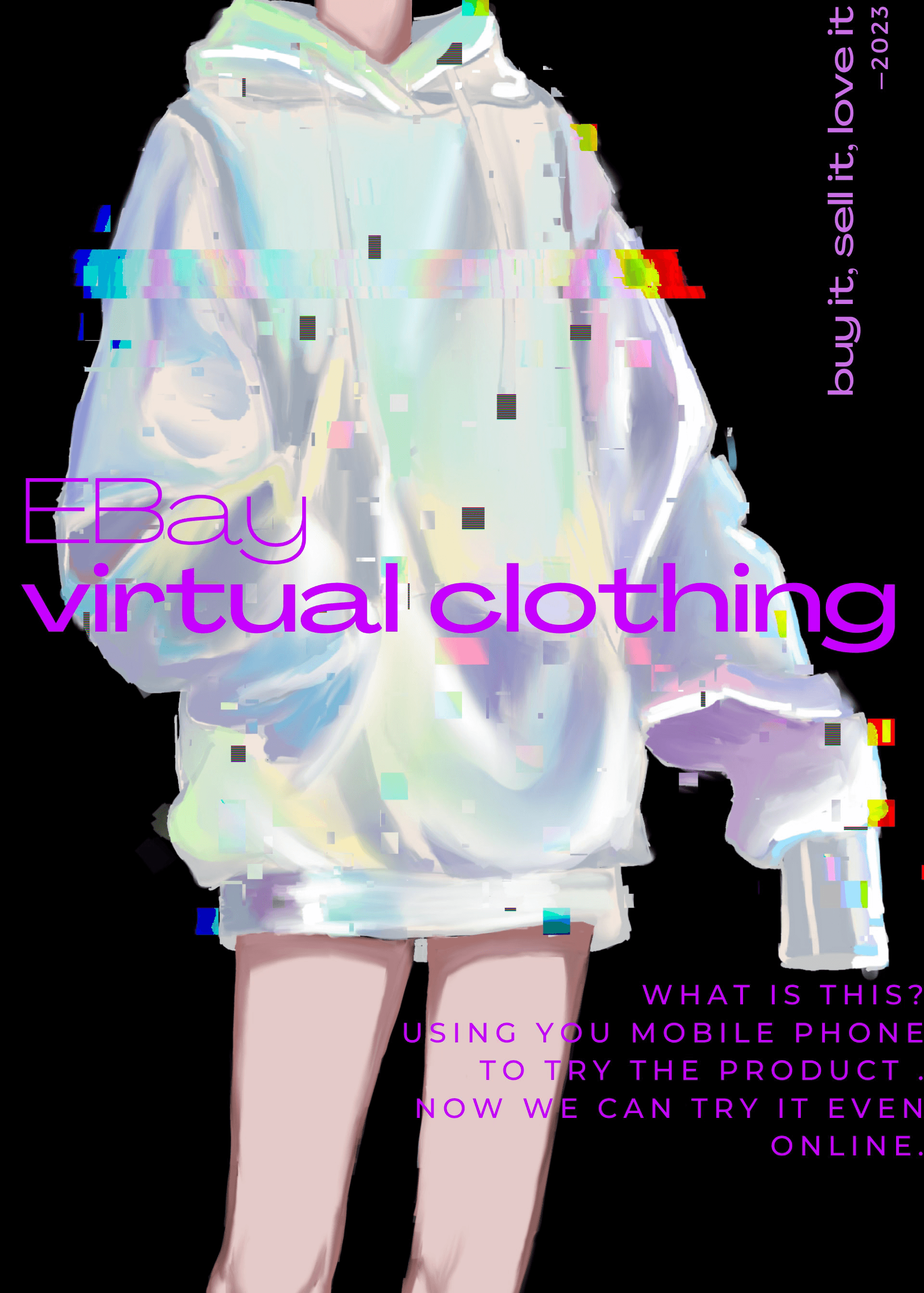 This project explores enhancing the eBay shopping experience for teenagers by addressing common weaknesses such as uncertainty about product quality and the risk of being cheated. Using a virtual clothing system, users can try on products like rings, hoodies, and shoes to better evaluate fit and quality before purchasing. The visual design emphasizes bold typography and minimalist layouts, with black backgrounds, textures, and subtle patterns to create a high-class, impactful aesthetic. The approach highlights eBay’s strengths—diverse products, mobile accessibility, and seller flexibility—while offering a creative solution to its limitations.