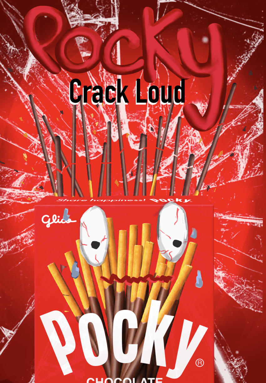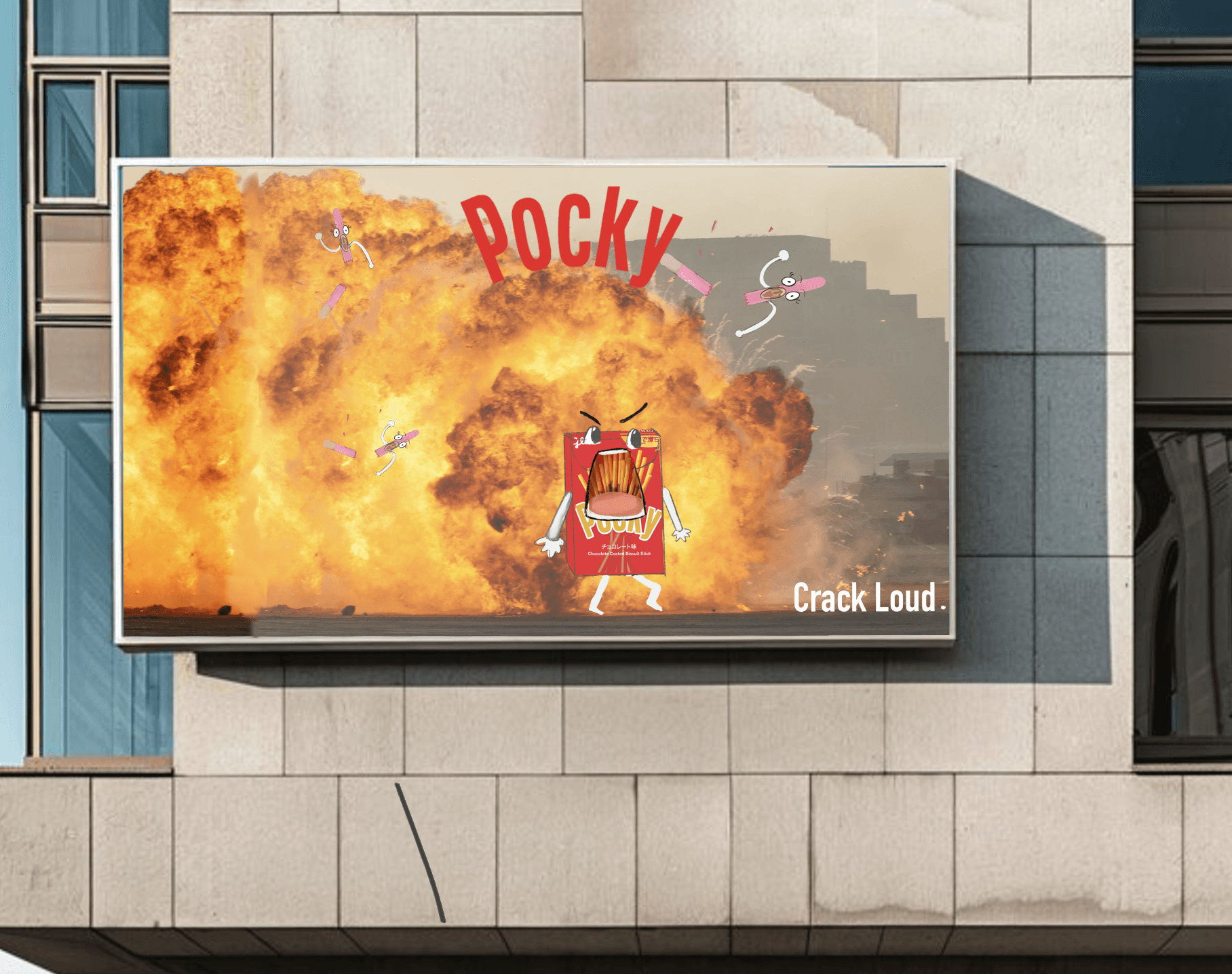 The main idea behind “Crack Loud” is to exaggerate the signature crunch of Pocky into an unexpected, over-the-top moment. By turning a simple snack break into a dramatic explosion, the concept transforms the everyday act of cracking a Pocky stick into something bold, fun, and impossible to ignore. The loudness isn’t just about sound—it represents the playful energy, excitement, and personality that Pocky brings to any moment. In this billboard, the cracking sound becomes so powerful that it creates a full action scene, with Pocky characters running from the blast and pieces flying through the air. This humorous exaggeration highlights how one small crack can create a big, memorable impact, capturing the spirit of the tagline: a snack that’s not just crunchy—it's loud, fun, and full of attitude.